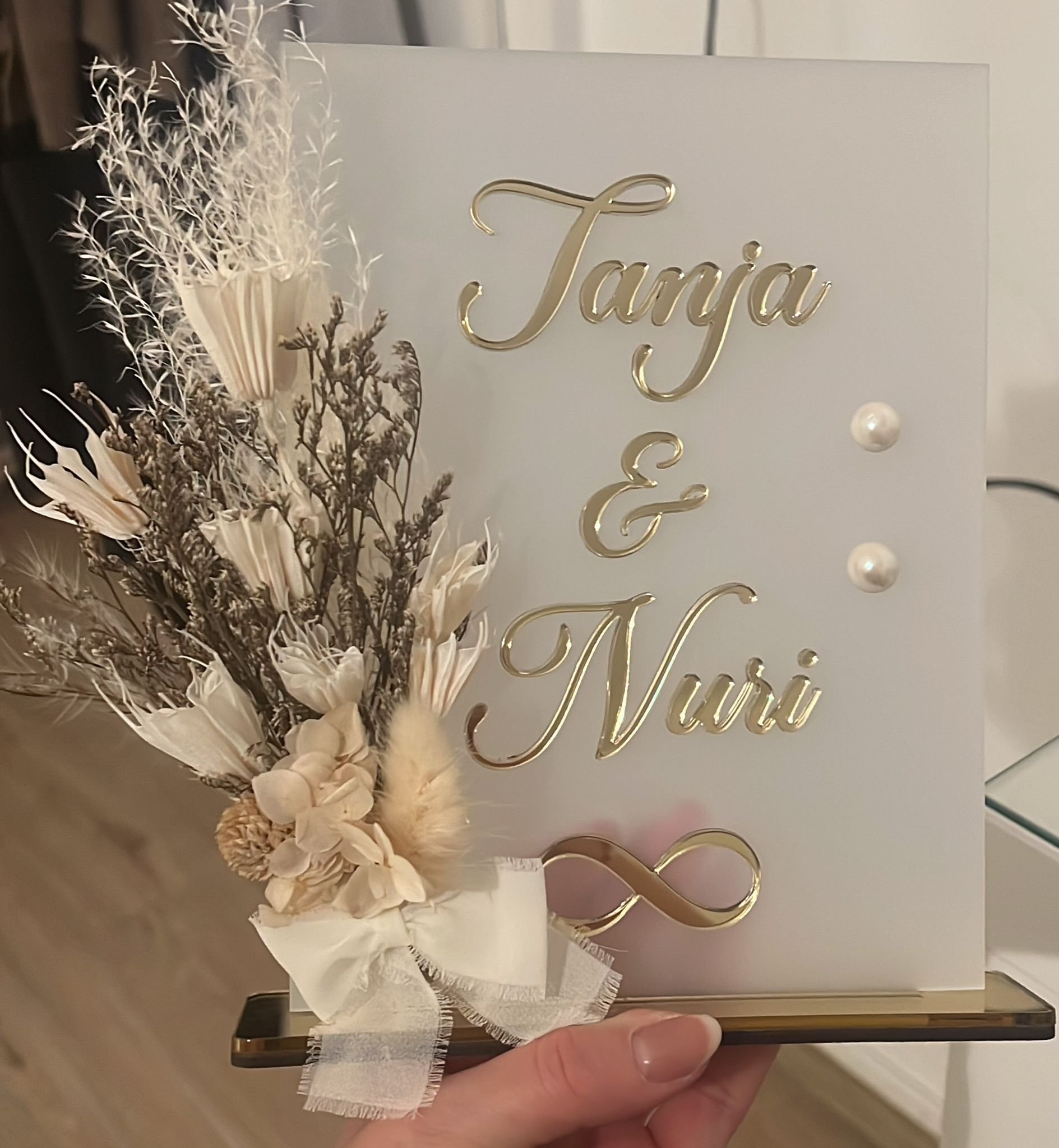 - Material: Acrylglas + Schrift, Rand und Fuss Spiegelgoldacryl oder Spiegelsilberacryl